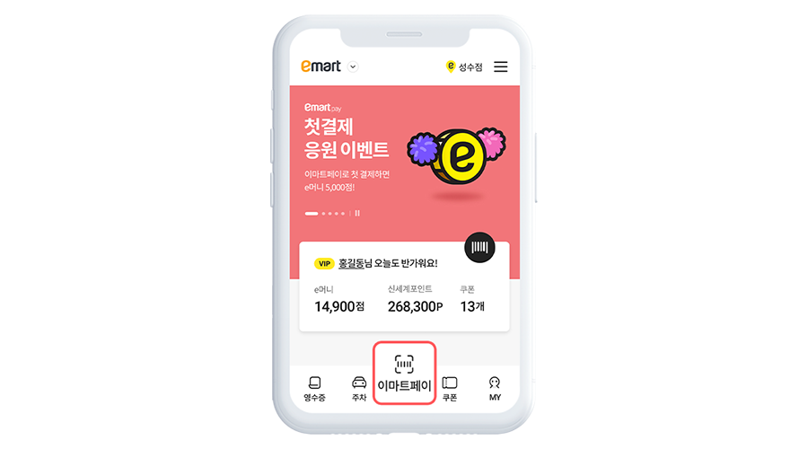 ‘이마트페이’ 메뉴는 이마트 앱을 최신 버전으로 사용할 시 첫 화면 하단에 자동으로 나타난다.