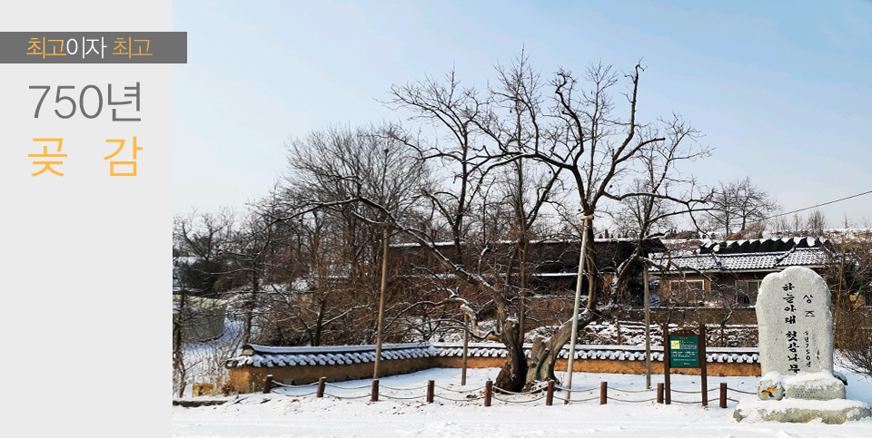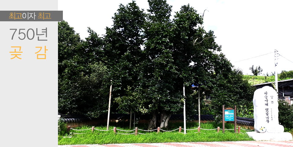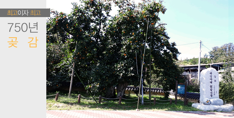 긴 세월의 풍파를 견디며 한 자리를 지켜온 ‘하늘 아래 첫 감나무’는 상주 곶감의 역사이자 상징이라 해도 과언이 아닙니다. 상주시도 2005년 3월, 보호수로 지정하여 이 나무의 보존을 위해 노력하고 있습니다. 덕분에 ‘하늘 아래 첫 감나무’는 지금까지도 매년 수천여 개의 감을 생산하며 왕성한 생명력을 뽐내고 있습니다.