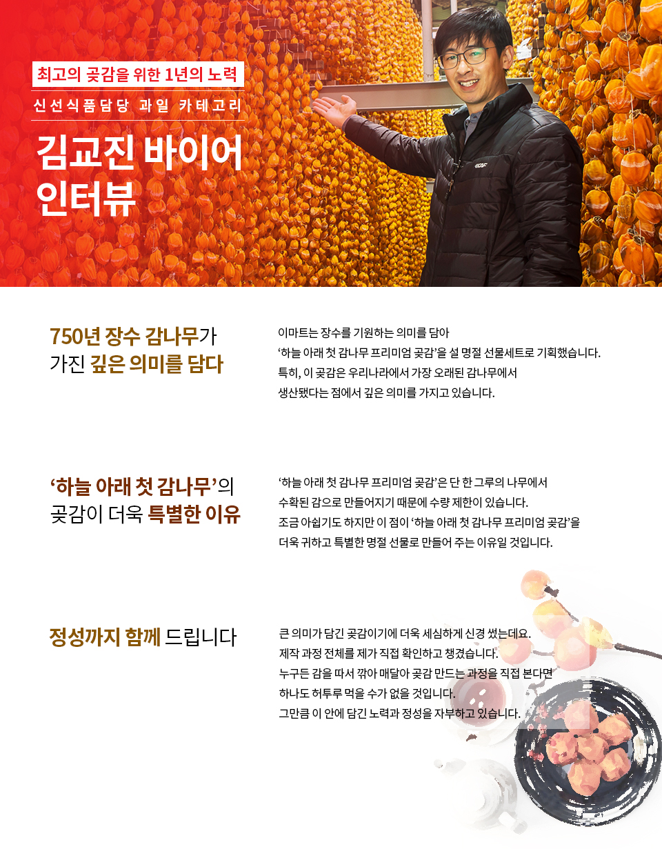 <하늘 아래 첫 감나무 프리미엄 곶감>을 준비한 이마트 신선식품담당 과일 카테고리 김교진 바이어는 자칭타칭 ‘곶감 전문가’ 인데요. 상주의 수많은 곶감 중에서도 최고의 맛에 특별한 의미까지 담긴 곶감을 찾아 상품화하기 위해 기획단계부터 공을 들였습니다. 특히, 제작과정 전체를 세심하게 챙기며 더욱 완벽한 상품 출시를 위해 노력했습니다.