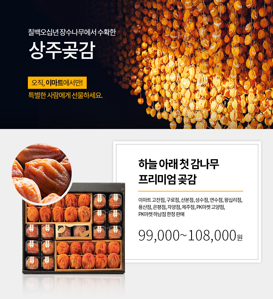 그리운 얼굴들 마주하며 서로 건강과 행복을 기원하는 민족 대명절 설. 이번 설에는 이마트가 정성스레 준비한 ‘하늘 아래 첫 감나무 프리미엄 곶감’으로 마음을 전해보세요. 최고의 맛 그리고 최고의 의미가 2018년 무술년 설을 더욱 특별하게 만들 것입니다.
