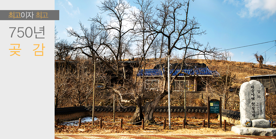 곶감 특구 상주에서도 최고(最高)이자 최고(最古)는 바로 ‘하늘 아래 첫 감나무’ 입니다. 이 나무는 수령 750년의 전국에서 가장 오래된 감나무인데요. 양쪽으로 갈라져 마치 두 그루처럼 보이지만 사실 뿌리가 같은 한 그루의 나무입니다.