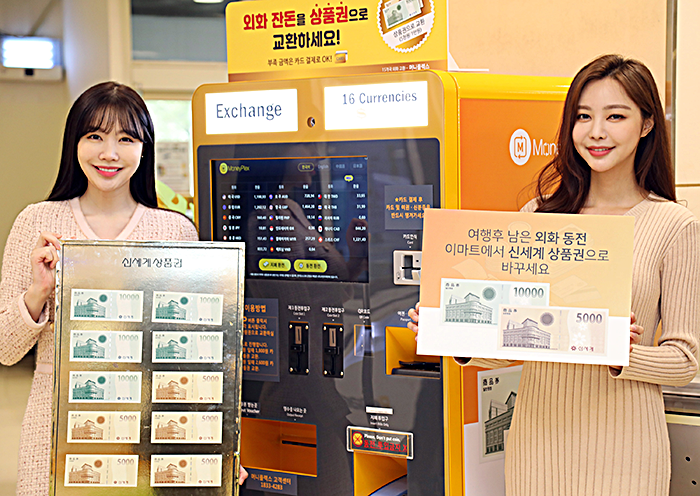 이마트가 ‘코인트래빗’ 업체와 협력해 이마트 성수, 용산, 죽점 3개 점포에 우선적으로 ‘머니플렉스’ 키오스크를 설치, 외화 교환 서비스를 제공한다. 향후 순차적으로 수도권으로 확대할 예정이다. ‘머니플렉스’는 외화 잔돈(동전 11개국, 지폐16개국)을 이마트에 설치된 무인 환전기에서 신세계상품권으로 교환 가능한 서비스를 제공하는 키오스크다. 한화 동전으로도 구매가 가능하다.