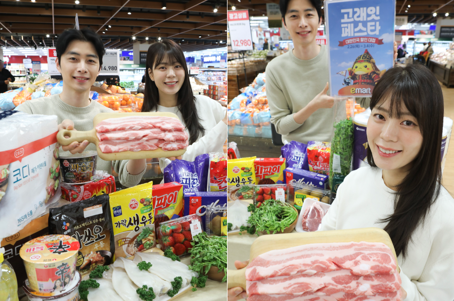2월 25일 수요일 오전 이마트 용산점에서 모델들이 봄맞이 ‘고래잇 페스타’ 1주차 행사 상품을 소개하고 있다. 2월 26일(목)부터 3월 4일(수)까지 진행되는 고래잇 페스타 1주차 행사에서는 봄 제철 먹거리부터 주류, 가전 등 인기 품목을 최대 50% 특가에 선보인다. 대표적으로 봄 제철 수산물인 ‘생 갑오징어(100g)’는 40% 할인된 2,388원에 선보인다. 또한 3월 3일(화) 삼겹살 데이를 앞두고, ‘탄탄포크 삼겹살/목심(100g)’은 880원 초특가에 선보인다.