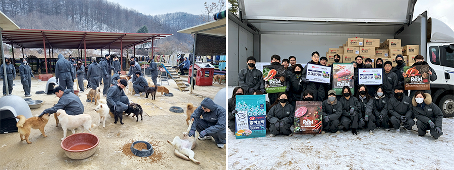이마트가 연말을 맞아 유기견과 유기묘를 위한 사료 2톤을 기부하고 유기동물을 위한 봉사활동에 나섰다.