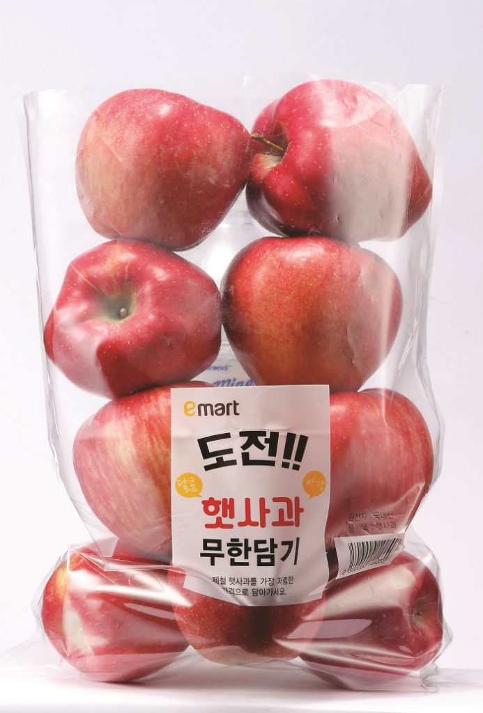 이는 기존 판매하던 봉지 사과(1.8kg/1봉, 8,980원)보다 100g 당 가격이 45% 가량 낮은 반값 수준이다.