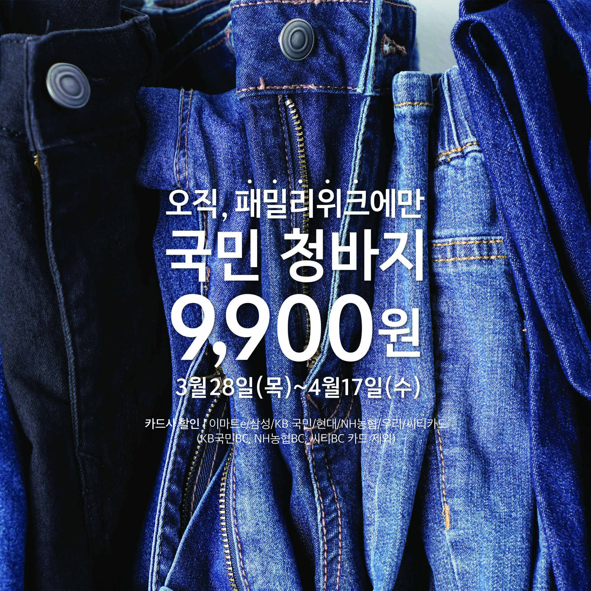 이마트가 1년에 단 한 번 선보이는 연중 최대 규모의 의류 할인 행사인 ‘데이즈 패밀리위크’를 통해 9,900원 청바지, 9,900원 티셔츠 등 성인 남, 여성부터 아동/유아에 이르기 까지 200여 종의 다양한 의류를 저렴하게 판매한다.