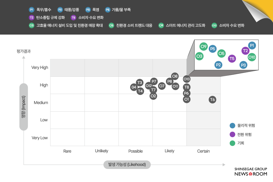 이마트는 국제 기준인 TCFD 권고에 따라 기후 리스크와 기회를 정량 분석했다. 폭우·태풍·가뭄 같은 물리적 위험부터, 강화되는 탄소 규제·친환경 수요 확대와 같은 전환 위험, 그리고 효율적 설비 투자나 친환경 상품 개발 같은 기회 요인까지 10대 핵심 이슈를 도출했다.