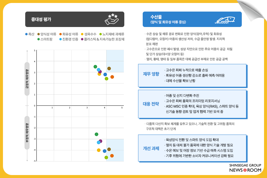 분석 결과, 양식 및 회유성 어류·노지재배 과채류 등이 해수온 상승, 수질 악화, 강우 등의 기후변화에 민감해 고위험군으로 분류됐다. 이는 실제 매출 감소와 조달 비용 상승으로 직결될 수 있는 경영 리스크다.