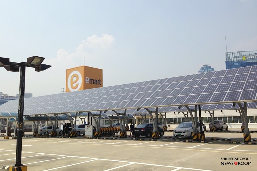 이마트 옥상에 설치한 태양광 발전 설비. 이마트는 2009년 업계 최초로 트레이더스 구성점에 태양광 발전 시스템을 설치했다.