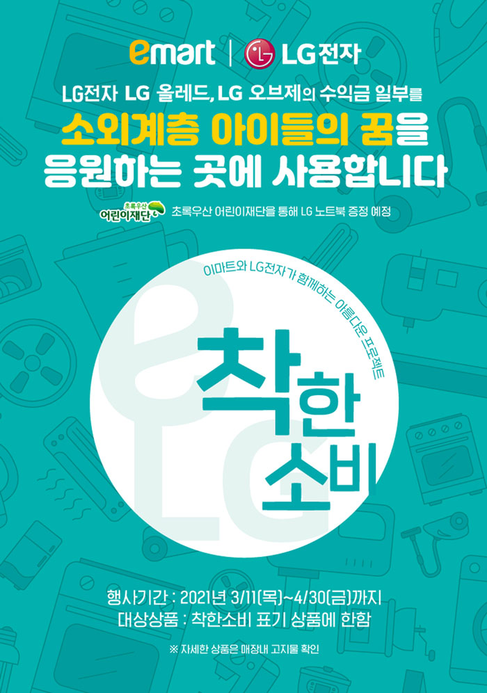 이마트와 LG전자가 오는 3월 11일(목)부터 4월 30일(금)까지 ‘착한 소비 프로젝트’를 통해 고객과 함께하는 사회 공헌 활동에 나선다.