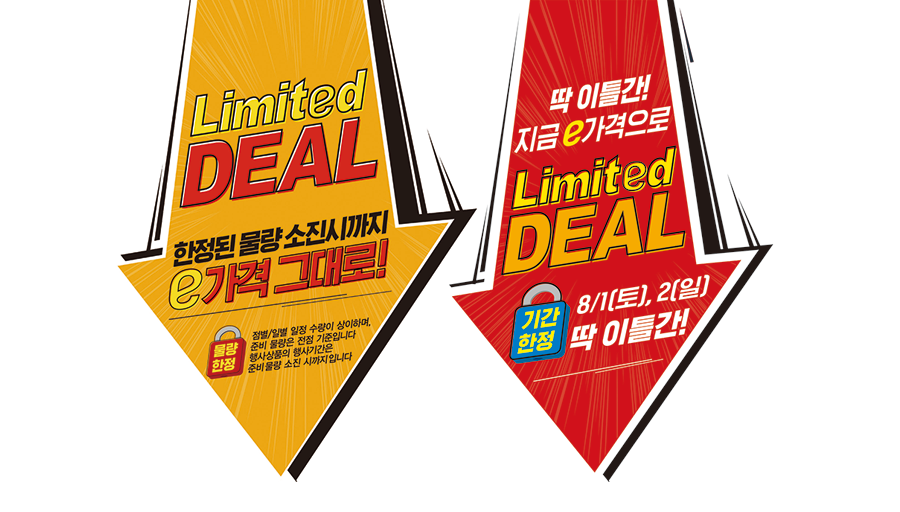 이마트는 지난 7월 2일에 물량 한정 리미티드 딜 행사를 선보였고, 7월 18일에는 주말 이틀 기간 한정 리미티드 딜 행사를 선보인바 있다. 지난 두 번의 리미티드 딜 행사는 주요 품목 완판 행진을 기록하며 큰 매출 신장을 보이는 등 소비자들의 반응이 매우 뜨거웠다. 이에 이번주에는 행사 규모를 더욱 확대해 물량 한정, 기간 한정 리미티드 딜 행사를 동시에 선보인다.