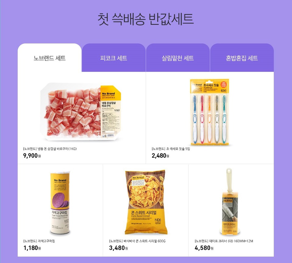 반값 패키지는 노브랜드 삼겹살, 자색고구마칩 등으로 이루어진 노브랜드 세트, 피코크 돈까스, 핫도그 등으로 이루어진 피코크 세트를 포함해, 두부, 식용유, 키친타올로 구성된 ‘살림밑천 세트’와 햇반, 냉동만두 등 ‘혼밥혼집 세트’를 중 1가지를 선택해 구매할 수 있다.