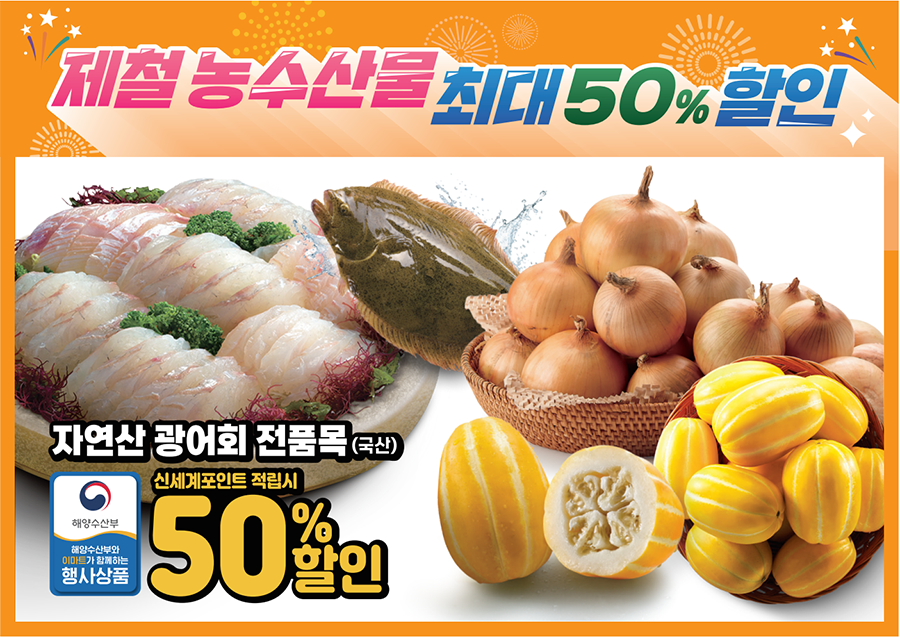 이마트가 오는 5월 10일(금)부터 16일(목)까지 제철 농수산물인 자연산 광어와 햇참외, 햇양파 등을 최대 50% 할인한다.
