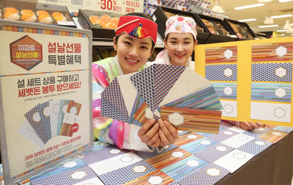 이마트가 설을 앞두고 설 선물세트를 구매하는 고객들에게 세뱃돈 봉투 세트를 제공한다.