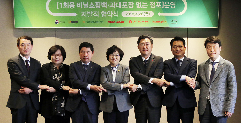 이마트를 비롯한 대형마트 5개사(이마트, 홈플러스, 롯데마트, 하나로마트, 메가마트)는 26일 오후 2시 서울 더플라자호텔에서 환경부와 ‘비닐/플라스틱 감축 자발적 협약’을 맺고 범국민 캠페인을 전개해 나가기로 합의했다.