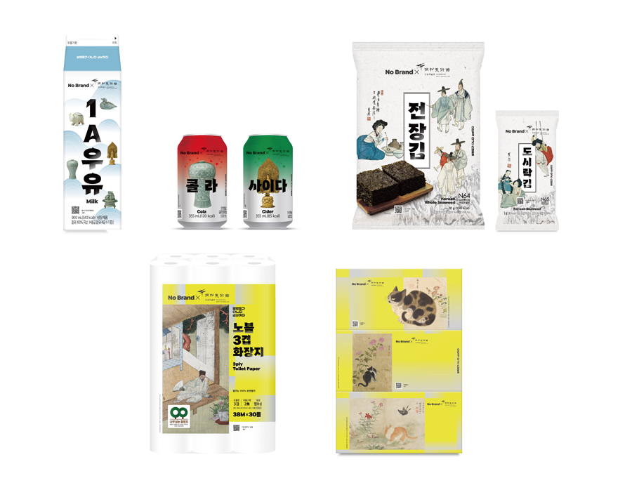 대표적으로 노브랜드를 대표하는 ‘노브랜드x간송미술관 1A 우유(900ml)’는 고려청자를 대표하는 걸작인 국보 ‘청자상감운학문매병’, ‘청자오리형연적’ 등을 패키지 디자인에 활용해 한국의 미를 자연스럽게 경험할 수 있도록 했다.
