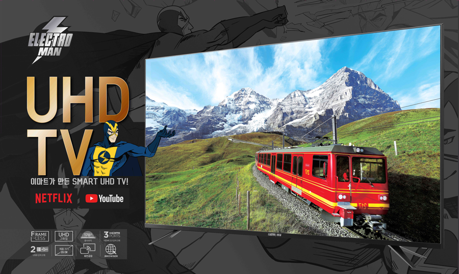 먼저 ‘일렉트로맨 50인치 UHD TV’는 이마트가 선보이는 일렉트로맨 TV 6번째 모델로, 3천대 한정 37만 9천원에 판매한다. 시중 유사 스펙을 지닌 상품 대비 40% 이상 저렴한 가격이다. 50인치 스마트TV임에도 불구 30만원대의 합리적인 가격을 자랑하는 일렉트로맨 50인치 TV는 ‘범용성’ 모델을 지향한다. 거실, 안방 등 어디에 설치해도 부담 없는 크기를 갖췄으며 인터넷강의용으로도, 게임용으로도 안성맞춤이다.