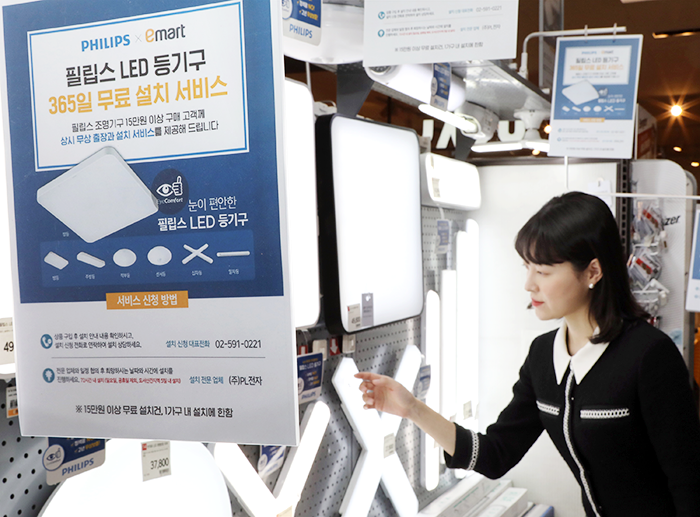 이마트가 단순 상품 판매를 넘어 설치 시공까지 제공하는 원스톱 쇼핑 서비스에 나선다. 이마트는 이달 26일(목)부터 필립스 LED 등기구 15만원 이상 구매 고객에게 대형마트 최초로 연중 ‘출장 및 설치 서비스’를 무상 제공하고, 이를 기념해 26일부터 내달 15일(수)까지 3주간 필립스 LED 등기구 7종을 20% 할인 판매한다.