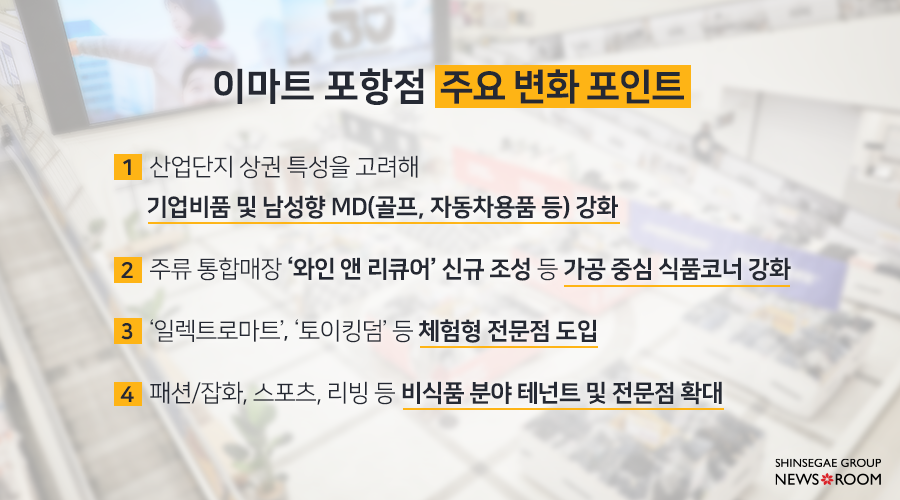 기업 비품 MD가 우세하다는 점에 주목해, 냉장음료 코너를 확대하는 등 커피/음료 상품 구색도 대폭 늘렸다. 기존보다 합리적인 가격대로 비품을 구매할 수 있도록 노브랜드 코너를 별도 조성했다. 이 밖에도 F&B(식음료) 시설의 이용률이 높은 포항점의 특성을 고려해 스타벅스 매장을 확대하고, 푸드코트도 새롭게 리모델링했다.
