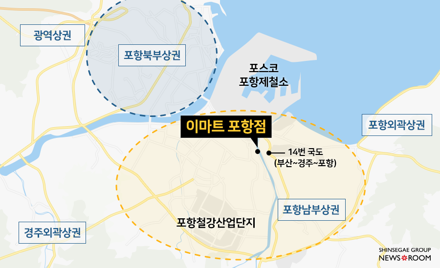 포항점의 경우 14번 국도(부산~경주~포항)와 인접해 있어, 광역 고객 비율이 높다. 포항점은 광역 상권에 대응하기 위해 경쟁력 있는 테넌트 및 전문점 매장을 새롭게 구성하며 색다른 쇼핑 경험을 제공하고자 했다.