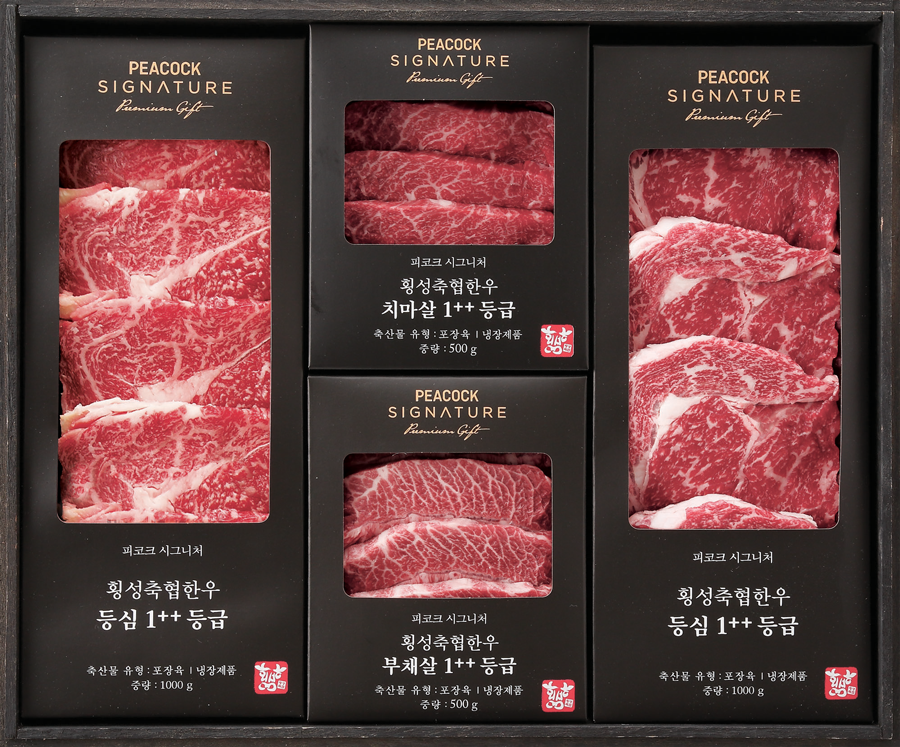 먼저, 프리미엄 선물세트의 대명사 한우 선물세트의 경우 신규 상품을 출시하고, 주요 인기 상품 물량을 대폭 늘렸다. 이마트는 올 추석 ‘피코크 한우구이 1++등급 세트(한우 1++등급 2kg)’, ‘피코크 한우 등심 1++등급 세트(한우등심 1++등급 2kg)’를 새로이 선보여 각각 35만원, 34만원에 판매한다. 행사카드 결제 고객에게는 10% 할인 혜택도 제공한다.