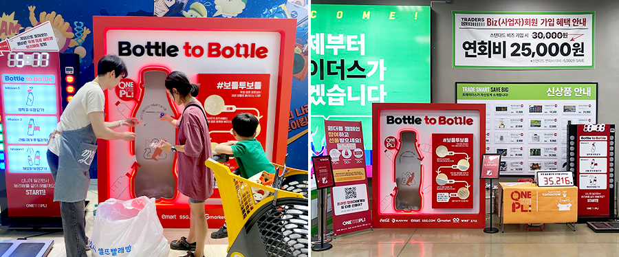 이마트는 원더플 캠페인으로 트레이더스 수원화서점에서 체험부스를 꾸렸다. 체험부스는 ‘페트병 수거 체험존’과 ‘보틀투보틀 게임존’으로 이뤄져 있다.