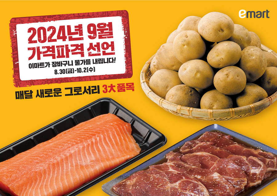 이마트는 오는 10월 2일(수)까지 한 달간 ‘9월 가격파격 선언’ 프로젝트로 감자, 양념 돼지고기, 연어를 선정해 특가에 판매한다고 밝혔다.