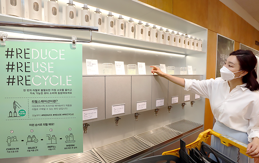 맞춤형 화장품법에 따라 맞춤형 화장품 조제 관리사가 상주하며 직접 제품을 리필 해준다. 또한, 버려진 플라스틱을 재활용해 만든 PCR (Post-Consumer Recycled) 플라스틱 전용 리필 용기(개당 500원)에 300ml / 500ml 용량을 선택해 구매할 수 있다.