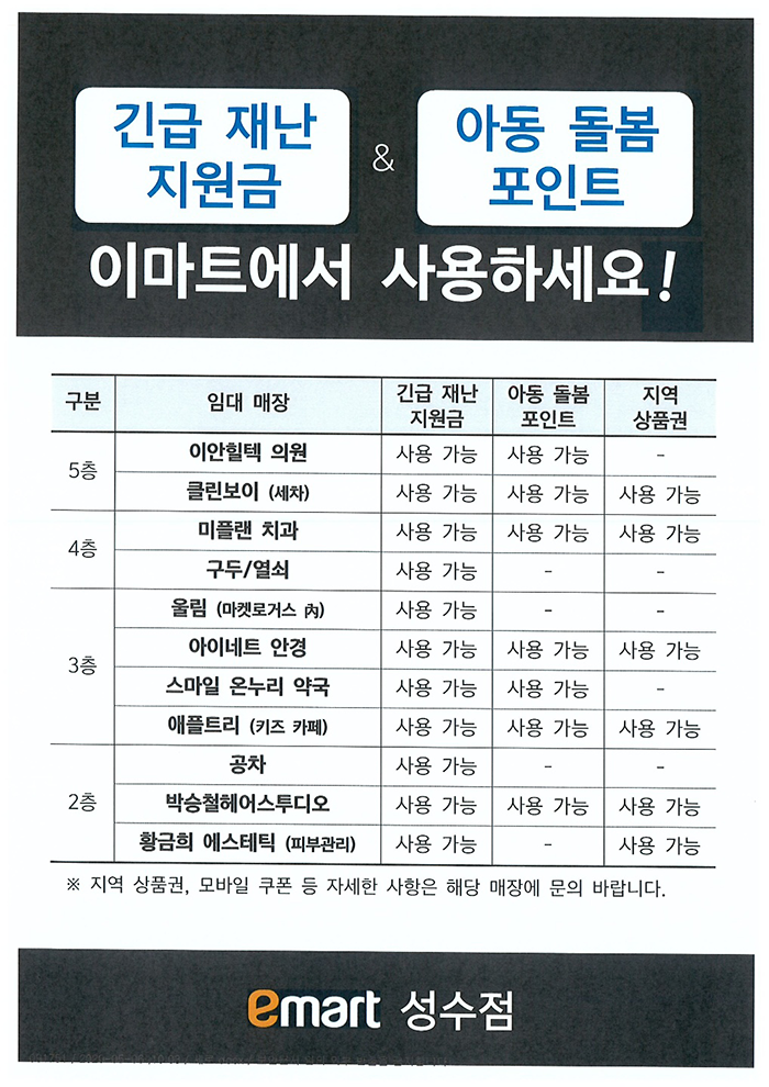 긴급재난지원금 주요 사용처를 살펴보면 이마트에 입점한 각종 임대매장 중 미용실, 안경점, 약국, 병원, 세차장, 키즈카페, 사진관 등 소상공인이 운영하는 점포이다. ※ 일부 매장 제외