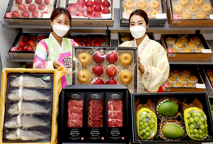 과일 선물세트에서는 국내 유명산지의 고당도 사과, 배만을 엄선한 ‘피코크 고당도 왕사과 왕배세트(사과6입, 배4입)’를 행사카드 할인가 8만9820원에 준비했다. 트렌드 세트인 ‘피코크 샤인머스캣&제주왕망고 세트(샤인머스캣2송이, 제주왕망고2개)’도 행사카드 구매시 30% 할인해 9만6600원에 판매한다.