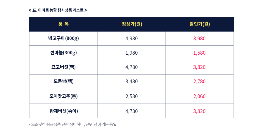 이마트와 SSG닷컴은 고객들에게 실질적인 도움을 드리고자, 시세 및 시의성 등을 종합적으로 고려해 고구마, 마늘, 표고버섯 등 6가지 품목을 행사상품으로 선정했다.
