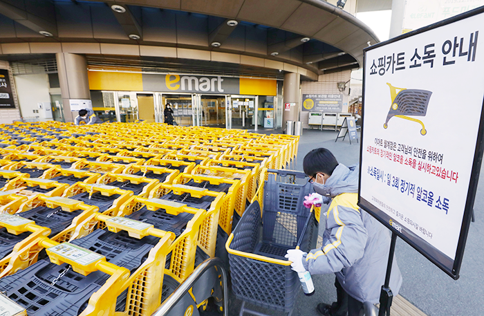 대형마트 특성상 고객 사용이 많은 카트 소독도 강화해 일 3회 매장 내 전 카트에 대한 소독 작업을 실시한다. 또 카트가 보관되어 있는 곳에는 소독 스프레이를 비치해 고객이 직접 카트를 소독할 수 있도록 조치했다.