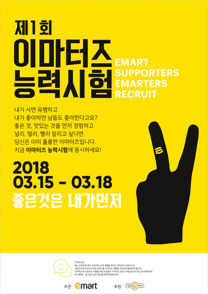 우선 1차 온라인 필기시험은 15일(목)부터 18일(일)까지 웹사이트(www.emarters.com)를 통해 응시할 수 있고, 시험은 이마트 대한 애정을 가늠할 수 있는 ‘덕력영역’과 SNS 활용성을 엿볼 수 있는 ‘스느스영역’, ‘고급취향 영역’ 및 ‘드립력 영역’까지 4개 영역에서 출제됐다. 온라인 필기시험에 합격한 응시자에 한해 오는 24일(토) 이마트 본사에서 2차 실기시험을 개최하고 최종 50명을 ‘e마터즈(이마터즈)’로 선발할 예정이다.