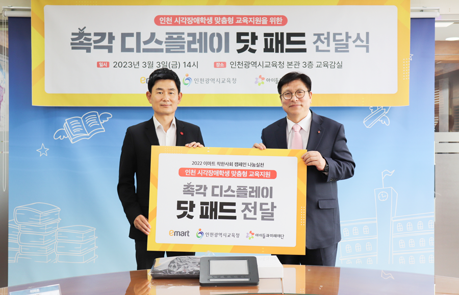 이마트는 ESG 경영의 일환으로 3일 오후 인천광역시 교육청에서 시각장애인들을 위한 교육용 점자 패드인 ‘닷패드’ 12개를 기부하는 전달식을 진행했다.