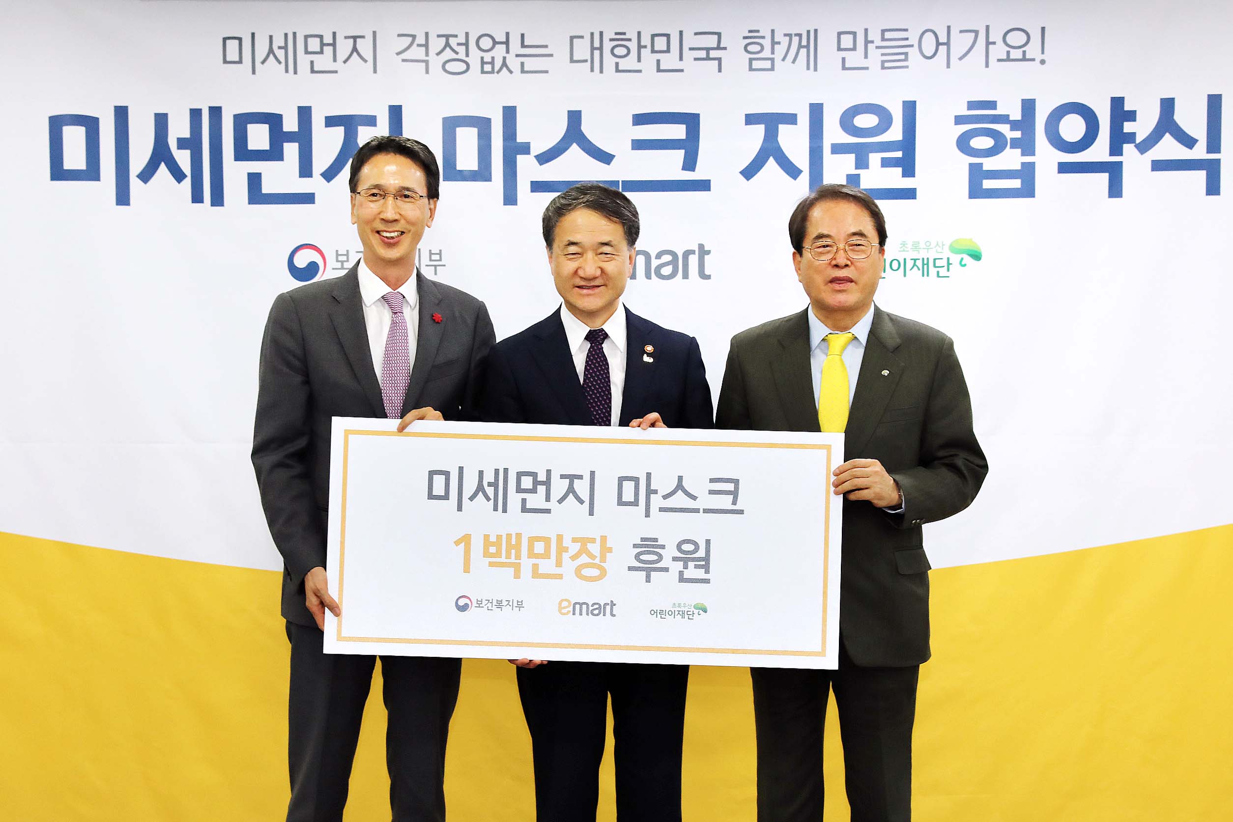 이번 업무 협약을 통해 이마트는 미세먼지 마스크 등 물품을 지원하고, 보건복지부와 초록우산 어린이재단은 대상자 선정 및 전달을 맡았다.