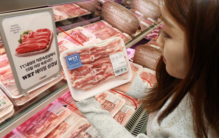 또한, 이마트는 최적의 숙성기간을 찾아내기위해 1주, 2주, 5주 등 각각 다른 기간 동안 삼겹살을 숙성하여 맛을 보는 등 자체 테스트를 통해 가장 맛있는 숙성기간인 ‘15일’을 찾았다. ‘웻에이징 삼겹살’의 가격은100g에 1,800원으로 대규모 숙성고 덕에 일반 삼겹살 가격(100g당 1,680원)과 비교해도 큰 차이가 없어 숙성 삼겹살 판매 비중이 크게 늘어날 것으로 예상된다.