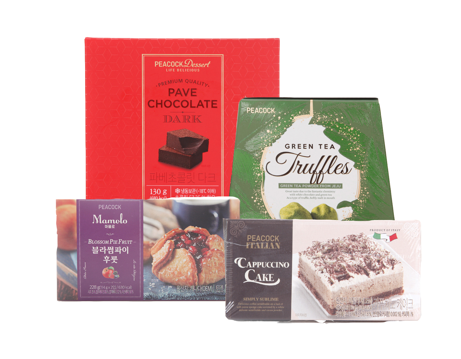 대표 상품으로 ‘피코크 티라미수 케익 150g’은 3,980원에, ‘피코크 생초콜릿 녹차/다크 37g’은 각 2,280원에, ‘피코크 벨지안 초콜릿 밀크/다크 100g’은 각 1,980원에 판매한다.