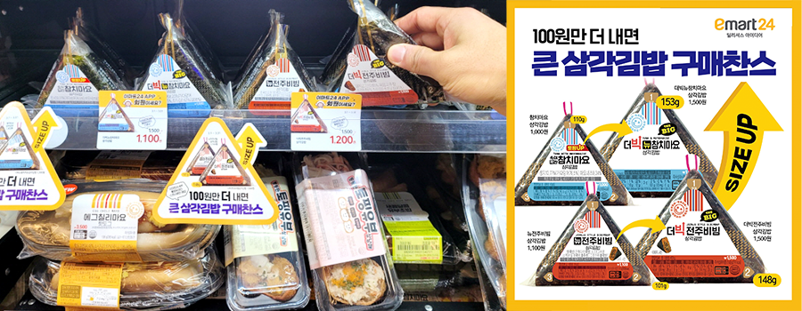 이마트24가 삼각김밥을 사이즈업 하는 위트 있는 이벤트를 선보여 재미와 혜택을 제공한다.