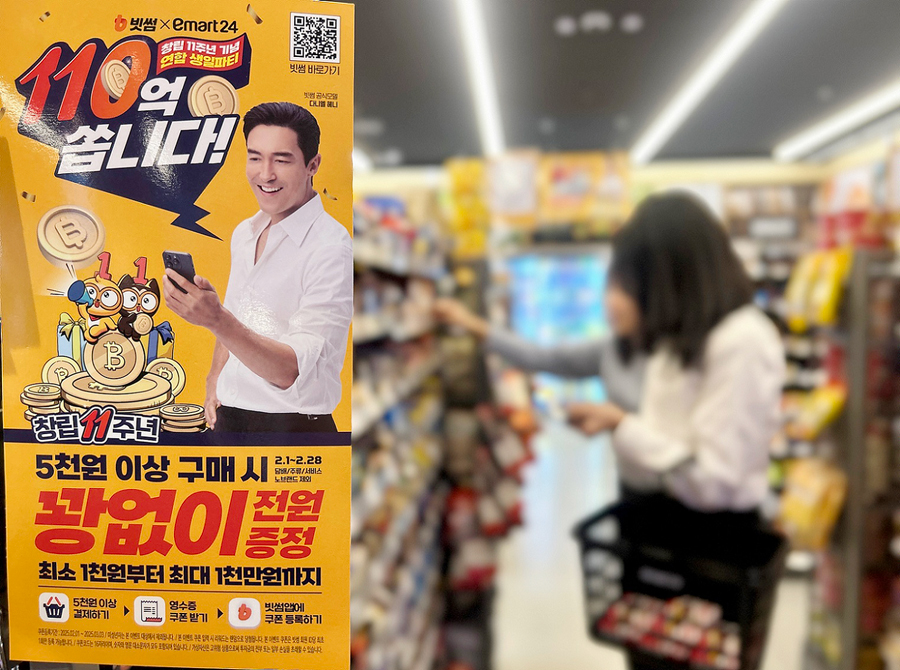 이마트24는 2월 말일까지 매장에서 5,000원 이상(담배/주류/서비스/노브랜드 제외)을 구매하는 고객 전원에게, 빗썸 앱에서 가상자산 거래를 할 수 있는 원화(KRW)를 선물로 준다.