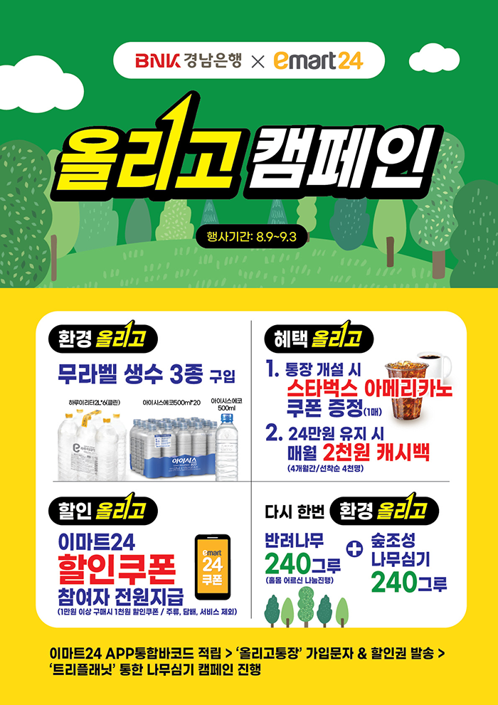 편의점 이마트24, BNK경남은행, 트리플래닛은 이달 9일(월)부터 다음 달 3일(금)까지 친환경 활동에 동참하는 ‘올리고’ 캠페인을 진행한다. ‘올리고’ 캠페인은 친환경 활동 참여와 고객 혜택을 함께 올린다는 의미로, ESG마케팅 일환으로 기획됐다.