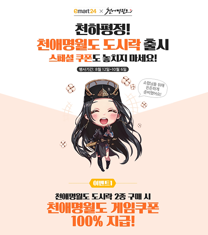 고객들은 도시락 구매 후 동봉된 쿠폰 번호 입력을 통해 천애명월도 게임을 즐기는데 유용한 아이템 5개(3만원 상당)가 모두 포함된 아이템 세트1)를 받을 수 있다.