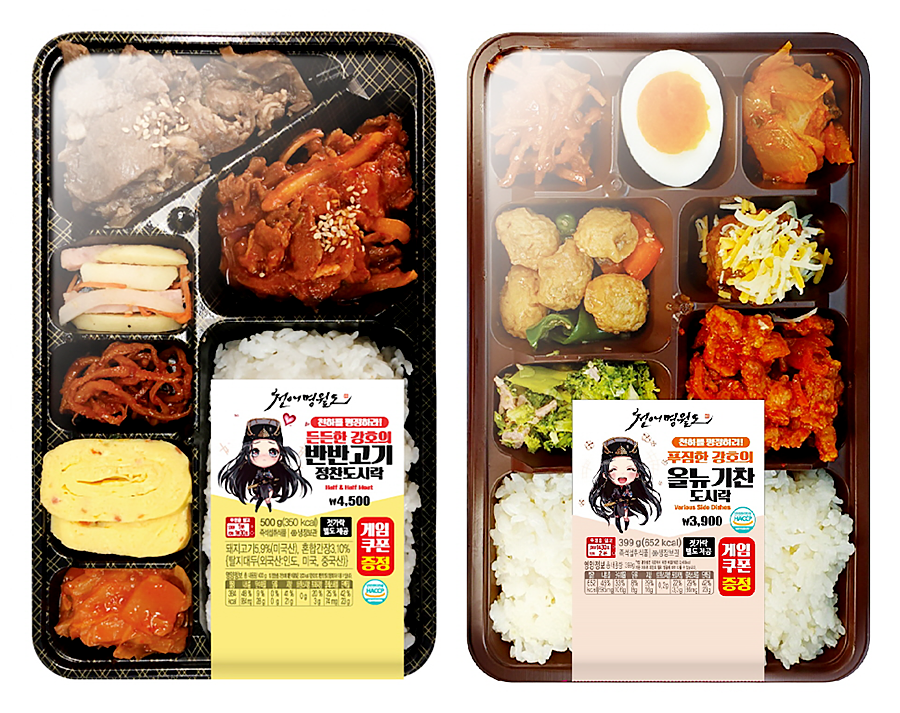 ‘든든한 강호의 반반고기 정찬’은 제육과 불고기 타입 2가지 고기 반찬과 감자볶음, 진미채, 계란말이, 볶음김치 등으로 구성된 도시락으로 가격은 4500원이다. ‘푸짐한 강호의 올뉴 기찬 도시락’은 3900원에 제육볶음, 미트볼, 브로콜리베이컨, 어묵볼, 계란, 진미채, 김치 등 집밥처럼 다양한 반찬을 즐길 수 있도록 구성해 가성비를 높인 상품이다.