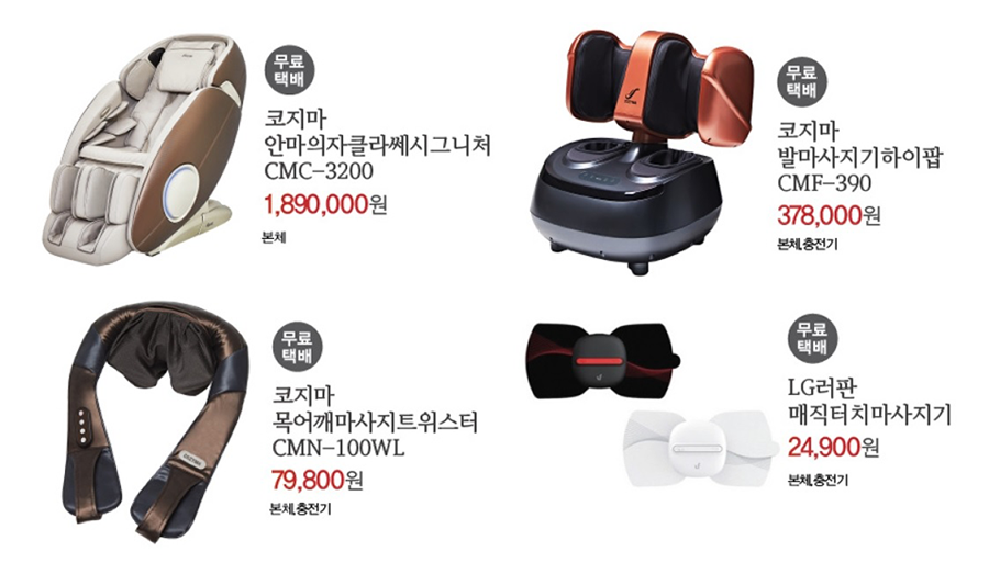 이마트24는 부모님을 위한 대표적 효도 상품인 안마의자(코지마클라쎄시그니쳐, 189만원)를 비롯해 코지마발마시기하이팝(378000원), 코지마 목어깨마사지트위스터(79800원) 등 4종의 안마기도 준비했다. 올해 지속되고 있는 코로나19로 인해 자주 찾아 뵙지 못하는 부모님께 선물을 드리라는 의미로 효상품을 준비한 것.