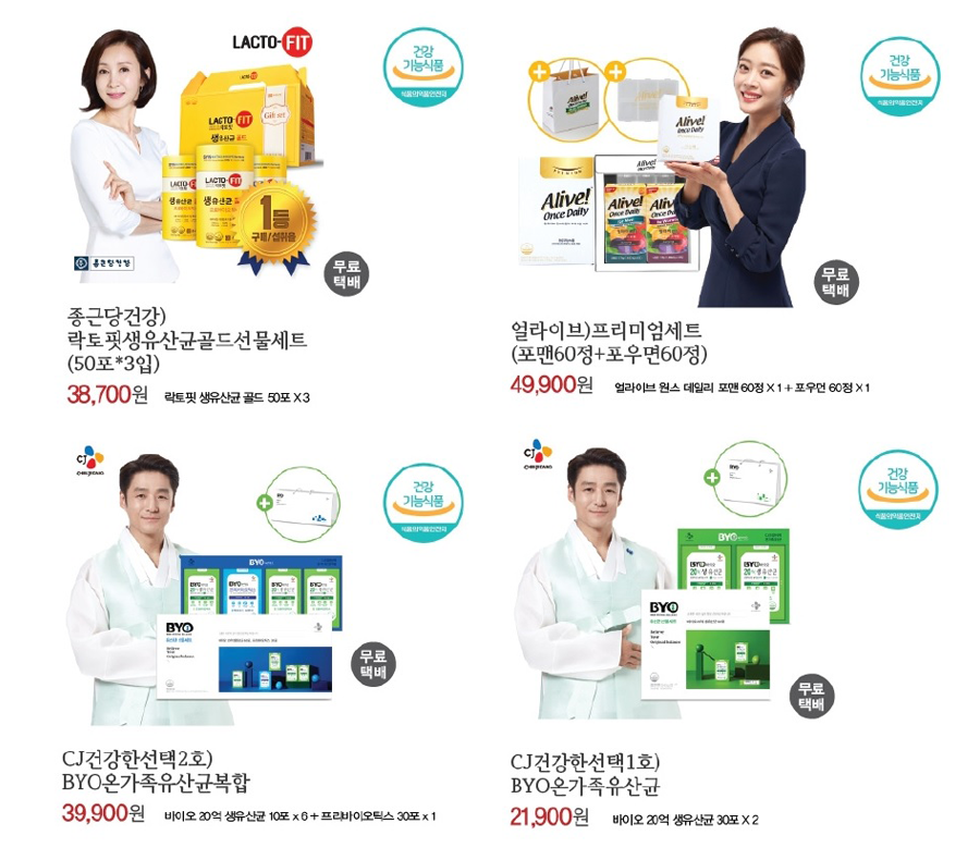 특히 얼라이브프리미엄비타민세트(49900원), 종근당건강‘락토핏생유산균골드선물세트’(38700원), CJ건강한선택1호/2호 BYO온가족유산균(21900원/39900원), 라이필더마콜라겐선물세트(139000원)는 올해 처음 판매하는 건강기능식품 선물세트다.