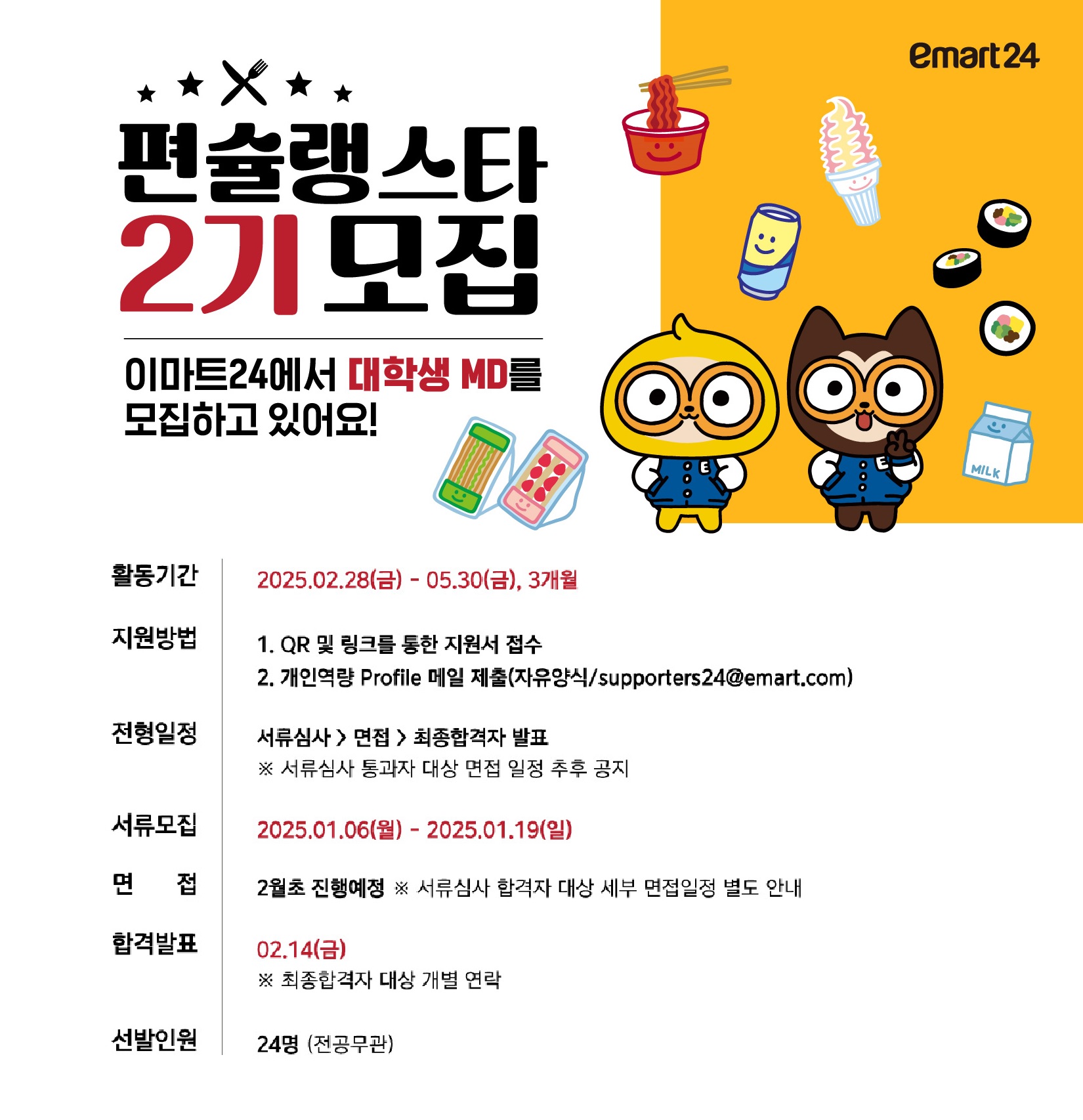 MEDIA 글자 크기 보통 크게 아주 크게 공유하기 페이스북 X 카카오톡 링크 복사 링크 복사됨 도구 보기 이미지 다운로드 이마트24, 대학생 MD서포터즈 ‘편슐랭스타’ 2기 모집! 2025.01.06 이마트24
