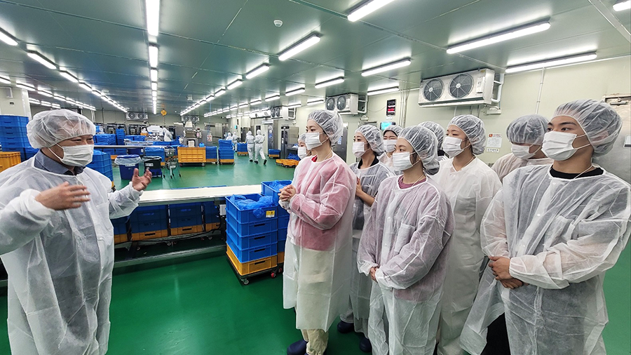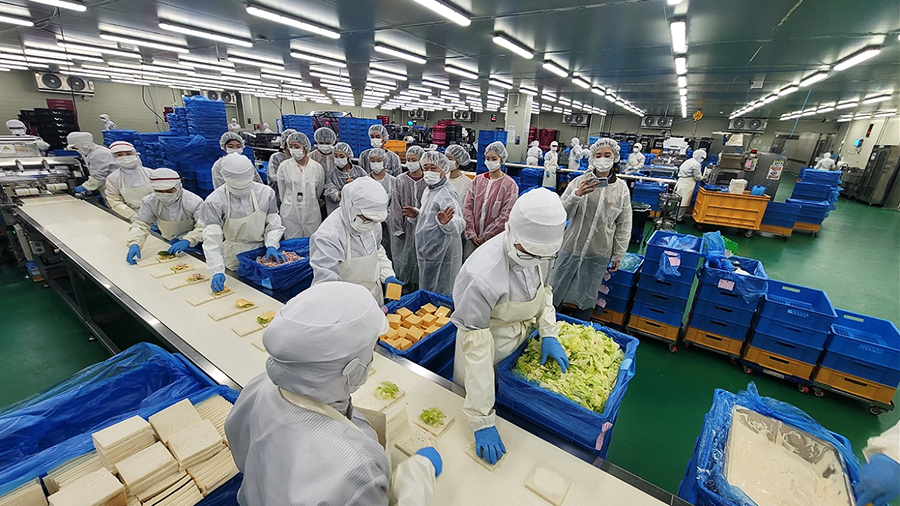 이날 대학생 서포터즈는 유동호 공장장의 안내에 따라 ▲식재료 관리 ▲조리 및 생산공정 ▲포장 ▲완제품 검사 ▲이물질 혼입 여부 검사 등 전반적인 간편식 생산 과정을 둘러봤다.