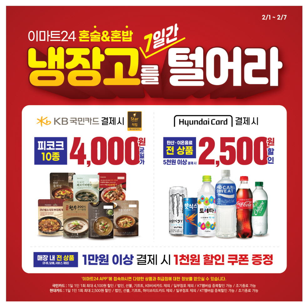 일주일 동안 이마트24는 감자탕, 마라탕, 한우고기곰탕, 잔슨빌소시지부대찌개 등 피코크 HMR 10종에 대해 KB국민카드로 결제 시 4천원 균일가에 판매한다. 감자탕이 9천원, 마라탕, 한우고기곰탕이 각 8천원으로 KB국민카드 결제 시 55%, 50% 할인 혜택을 누리며 구매할 수 있다. (기간 내 1일, 1인, 1회 최대 4100원 할인)