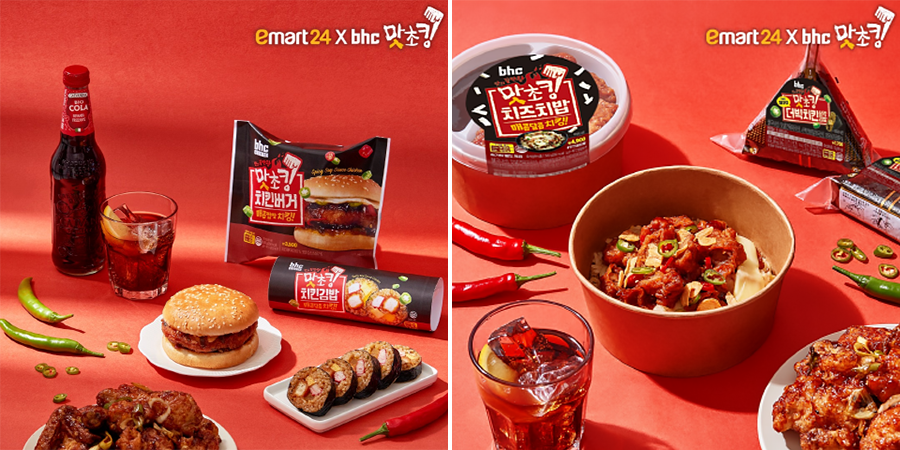 이마트24가 이번에 bhc치킨과 협업하여 판매하는 상품은 ▲ 맛초킹치즈치밥 ▲ 맛초킹더빅치킨삼각김밥 ▲ 맛초킹치킨버거 ▲ 맛초킹치즈김밥 ▲ 맛초킹닭다리과자(오는 21일 출시 예정) ▲ 맛초킹후랑크바(오는 21일 출시 예정)이다.