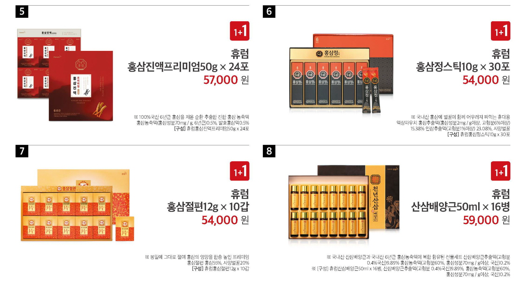 특히 휴럼홍삼정스틱10gx30포(54000원) 등 휴럼 건강기능식품 4종과 광동의감쌍화10gx30포(40,000원), CJ한뿌리흑삼10입(70,000원) 등 6종은 1+1으로, CJ한뿌리인삼/홍삼/마 등 한뿌리 시리즈 3종과 웅진장쾌삼발효홍삼력85mlx10입(39,000원) 등 4종은 2+1으로 판매함에 따라 고객들의 큰 호응이 기대된다.