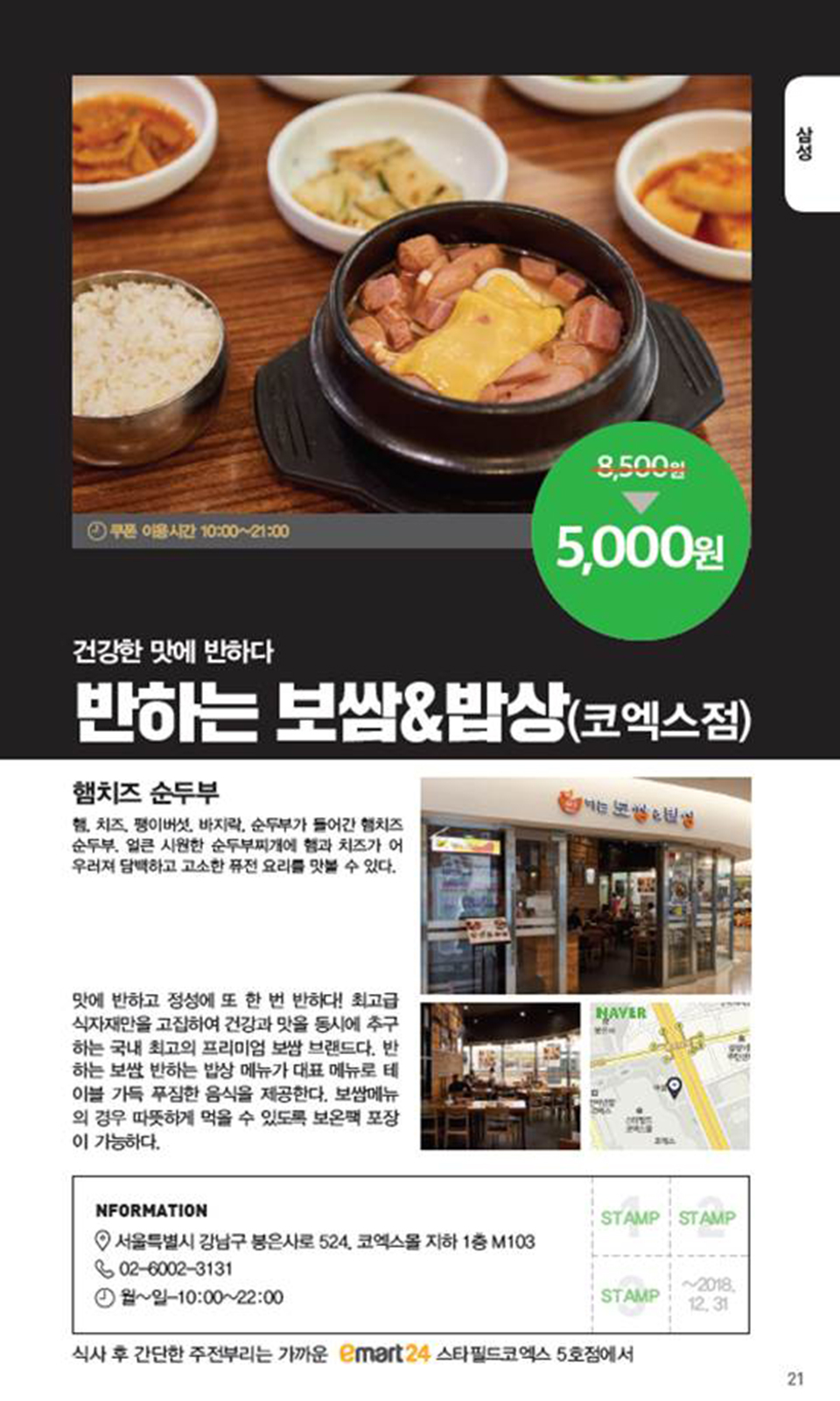 이용 방법은 간단하다. 결제 시 해당 음식점이 나와있는 페이지를 보여주면 업체가 스탬프를 찍어주는 방식이다. 유효기간은 18년 12월 31일까지다.